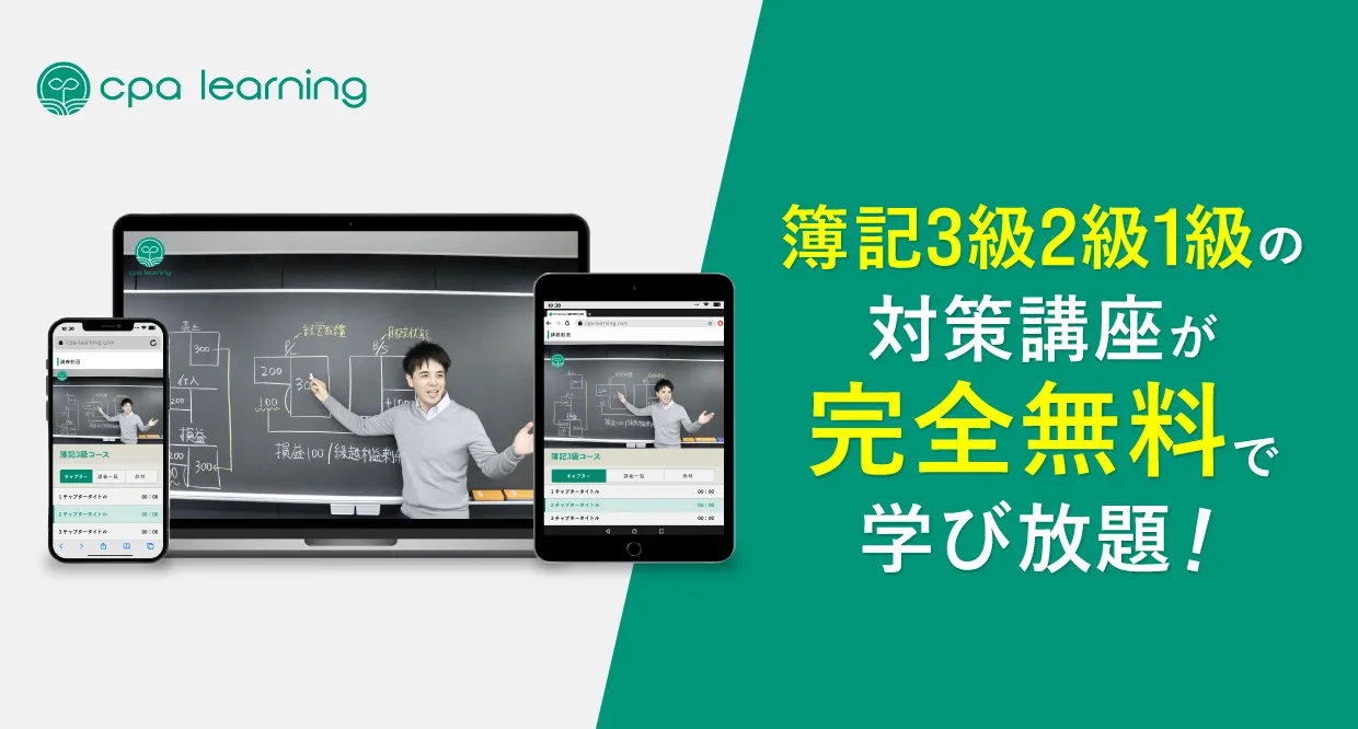 CPAラーニングは、日商簿記3級、日商簿記2級、日商簿記1級すべてが無料で学び放題のサイトです。